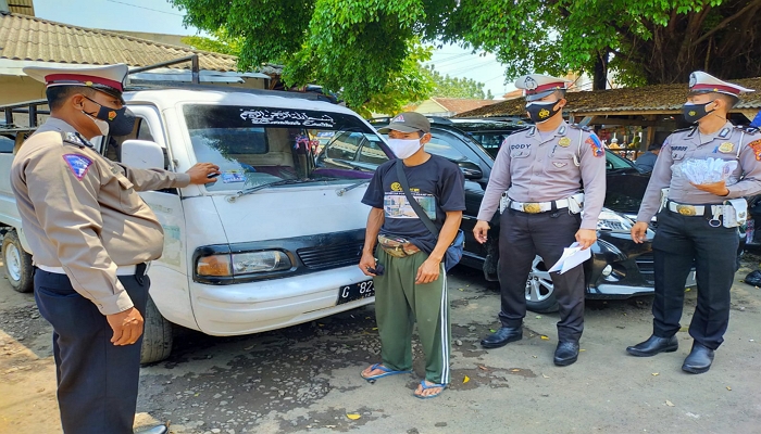 Selain pembagian masker, Satlantas Polres Pekalongan juga mengajak warga untuk mematuhi dan disiplin prokes dengan cara menempelkan stiker bertuliskan ‘Ayo Pakai Masker’ di kendaraan pribadi, angkutan umum, dan angkutan barang.